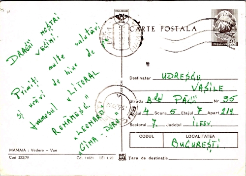 În plan secund, în perspectivă, hotelurile Aurora, Meridian, Doina, Flora, Victoria din Mamaia. În prim plan, apa și plaja Mării Negre, pline de vilegiaturiști.