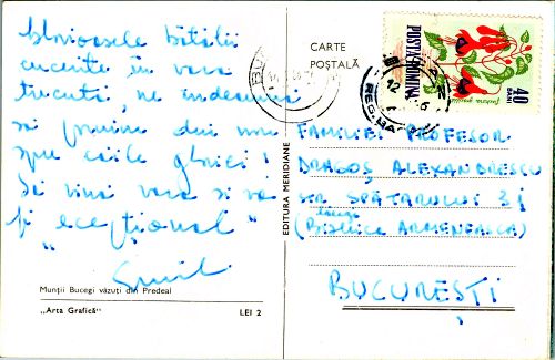 Panoramă asupra Munților Bucegi văzuți din stațiunea Predeal. Peisajul este unul de iarnă. Felicitarea conține pe copertă următoarea urare: "La mulți ani!"